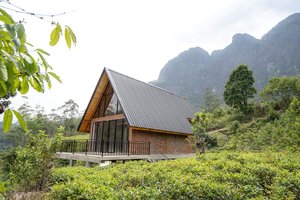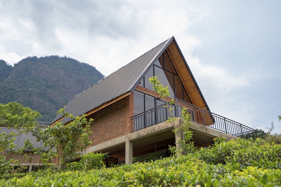 Modern cabanas embraced by the serene beauty of a lush tea estate